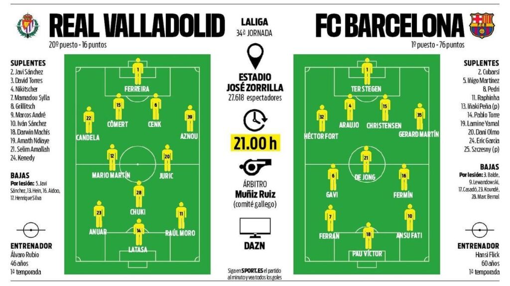 Aufstellungen: Teilnehmer: Real Valladolid gegen FC Barcelona – das ist ein Thema, das Fußballfans in ganz Deutschland und Europa immer wieder fesselt. Wenn der große FC Barcelona auf den kämpferischen Real Valladolid trifft, geht es um mehr als nur drei Punkte. Es ist ein Clash zwischen einem Titelaspiranten und einem Team, das um jeden Meter kämpft. In der Saison 2024/25, besonders beim Spiel am 3. Mai 2025 im Estadio José Zorrilla, zeigten beide Mannschaften, was La Liga so aufregend macht. Barcelona drehte ein Rückstand in einen 2:1-Sieg und baute den Vorsprung an der Tabellenspitze aus. Doch was genau waren die Aufstellungen: Teilnehmer: Real Valladolid gegen FC Barcelona? Welche Spieler standen auf dem Platz, und warum waren diese Entscheidungen so wichtig? Lass uns das gemeinsam anschauen – mit vielen Details, die dir helfen, das Spiel besser zu verstehen. Es ist eine Geschichte von Taktik, jungen Talenten und purem Kampfgeist.